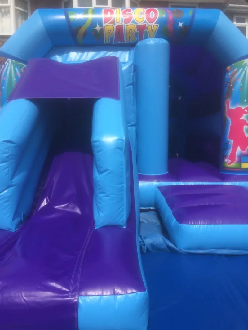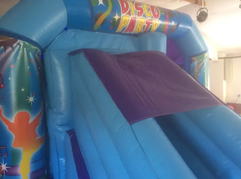 This great Disco theme bouncy castle with slide includes its very own disco sound and led lighting system for the ultimate bounce, slide and boogie combination a real must for any childs party, Save money with no need for a disco, great for children's disco parties and bouncy castle parties.