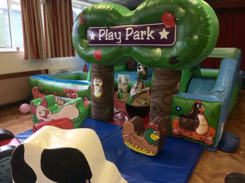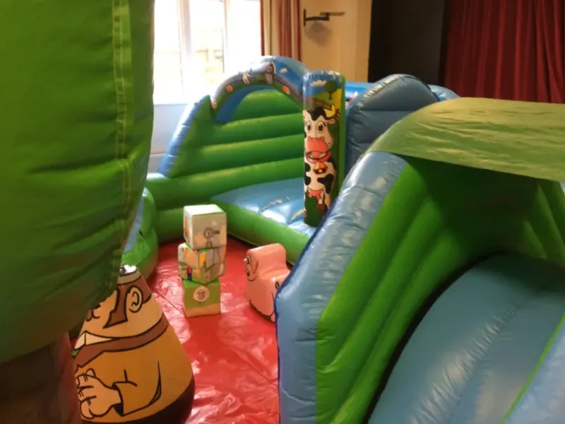 Soft play parties have become all the rage for toddlers parties in Weymouth and Dorset, this soft play farm yard Play centre is the ultimate soft play party package for toddlers up to 5 years old. Its absolutely guaranteed to please nearly all the excited little children at your child's party. This all in one party package has everything they need covered, it contains a toddler bouncy castle with a good sized bouncing area and a great hand painted tractor on the back wall , and a fantastic up and over covered in slide, with covered foam steps that gently slope up the slide, inviting children to crawl in and explore and then slide out once at the top and a magical ball pond where the balls float in mid air the children find this truly amazing, all in a fantastic Farmyard theme with matching farmyard soft play set. Supplied with some soft play shapes and you can add the new soft play tractor for £40 including mats, this is an amazing bit of kit for children's parties and events and is a fantastic way to get the children interacting with each other, this is a must for young children's parties in the Dorset area. And look out Farmer Giles is on hand to watch over your party.we were the first in the south west to have a farmyard soft play center made for hire. We lead others follow. Book today on 01305 772741 or use the contact page