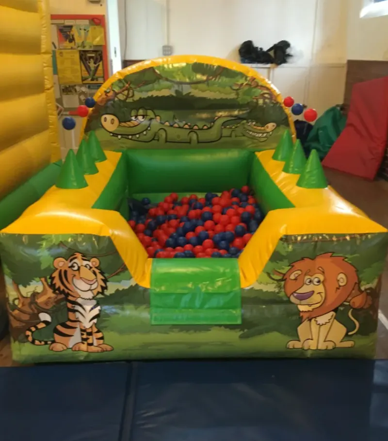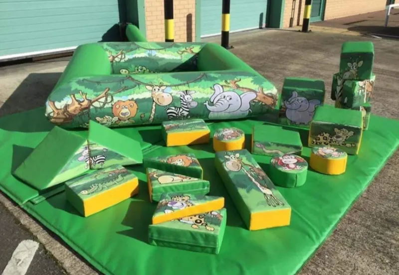 Consist of amazing jungle bouncy castle slide combo, a fantastic new jungle themed chocolate ball pool and of course a multitude of soft play shapes and figures also jungle themed . As with all our soft play packages safety mats are provided. I jungle themed bouncy castle soft play package it's very popular and is often used for Lion King parties and Madagascar parties so don't delay book today.