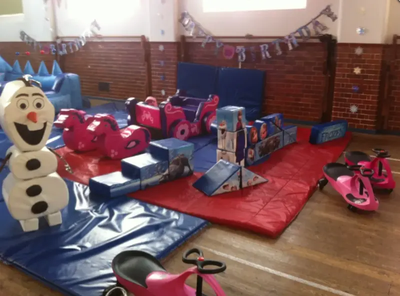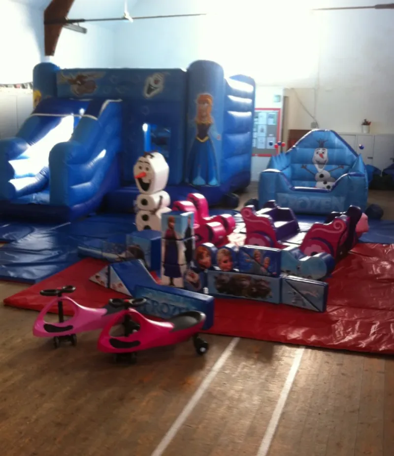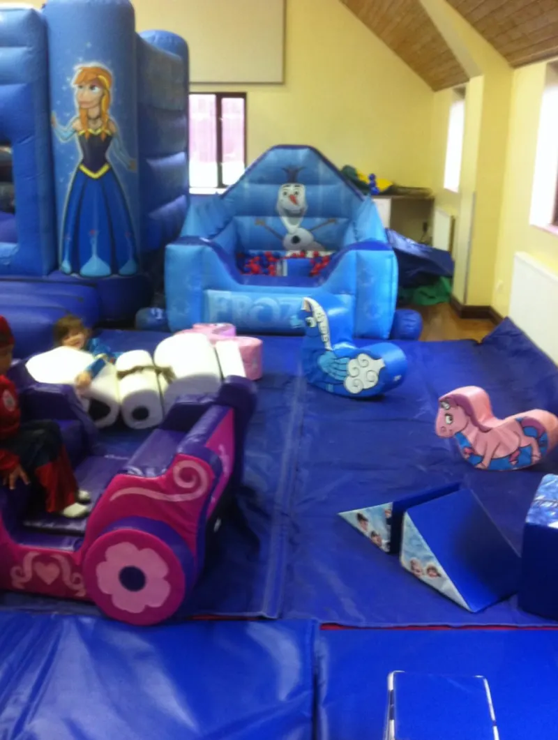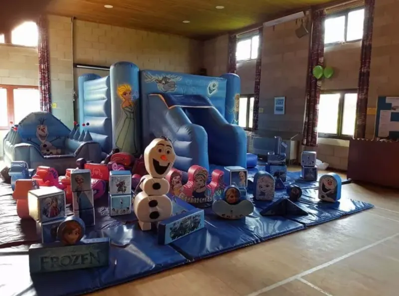 Our Frozen princess bouncy castle slide combo is the center piece of this amazing party package, with Elsa & Anna painted on the front pillars looking over your Frozen birthday party. There are lots of entertainment ideas in this penny saving extravaganza of frozen and you could almost be in the blockbuster movie itself once you step on to the enticing blue safety mats and stand next to our build Olaf soft play figure, he must be the most famous snowman of all time.