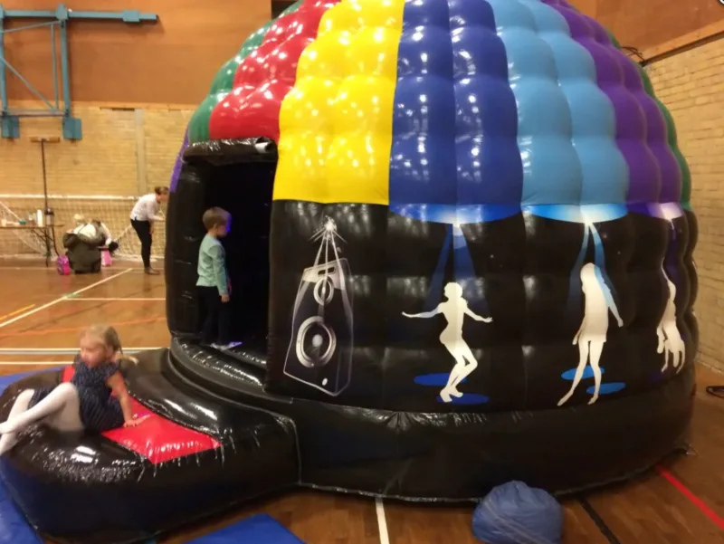 Weymouth bouncy castles latest exciting product is our fabulous mini disco dome. A great way of entertaining those under 8's at children's birthday parties, not only do you benefit from the bouncy castle bed to bounce on, but you get the a mobile disco or childs disco with flashing lights as well as music thrown in under the one roof . Disco dome parties are available in Weymouth, Dorchester and the surrounding areas of Dorset. This inflatable bouncy disco dome is absolutely fantastic and children love them. Available all over Dorset for Children's parties and events, with its brightly coloured dancing people around bouncy base it catches the eye of all that see. Once the children enter the bouncy disco dome they become enchanted by the spinning light discharging an array of bright beams of flashing colours on to the inner walls and bouncy bed as it rotates to the music's beat. The music can be of any sensible volume, but children seem to enjoy it most when its thumping at its loudest with the light pulsing beams of light the beat of your chosen music, creating your very own bouncy castle disco party. Music is easily bluetoothed through the speaker from any device so children can have their very own playlist or we can provide a usb