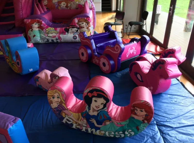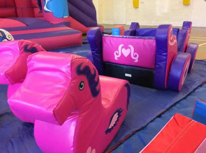 We have the greatest range of princess soft play in Dorset and probably the best quality princess soft play in Dorset area as well. So much princess soft play to choose from, we have soft play princess rockers, princess blocks, digital printed soft play we even have a soft play princess carriage with winged rocking horses, we have actual animals and rockers that are soft play and not cheap plastic toys not fit for hire. Have a gander at our princess soft play pictures and choose the items you require for your princess soft play party in Weymouth and Dorset. we also do Pink princess party packages with princess bouncy castles, ball pools and pink princess didi cars