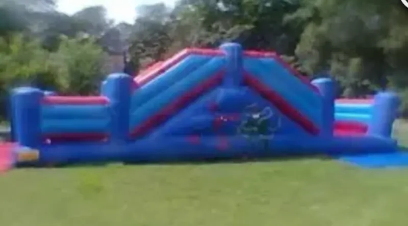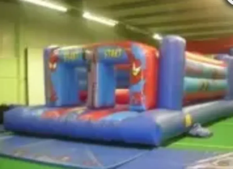 This fantastic 46ft assault course is the ultimate multiply inflatable and is the most exciting inflatable attraction at any event because children just love the adventure and physical challenge that it provides. This assault course is ideal for village fetes, fun days, school fetes, holiday camps, corporate events, private parties, charity events, bqs the list is endless. Children enter at the start, clambering in through the two arches, they then enter a bouncing area with inflatable biff bash with super hero's painted all over them, once they have pushed the super hero's aside they climb through two holes into another bouncing area, here they bounce and wait there turn to climb to the top of the slide on foam steps. They then reach the top and slide down FEET FIRST to the bottom of the slide were they exit the inflatable at the side and run back to the start. This will wear out even the fittest of children. The inflatable obstacle course is the ultimate bouncy castle. Book this quick.