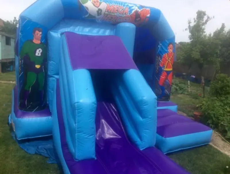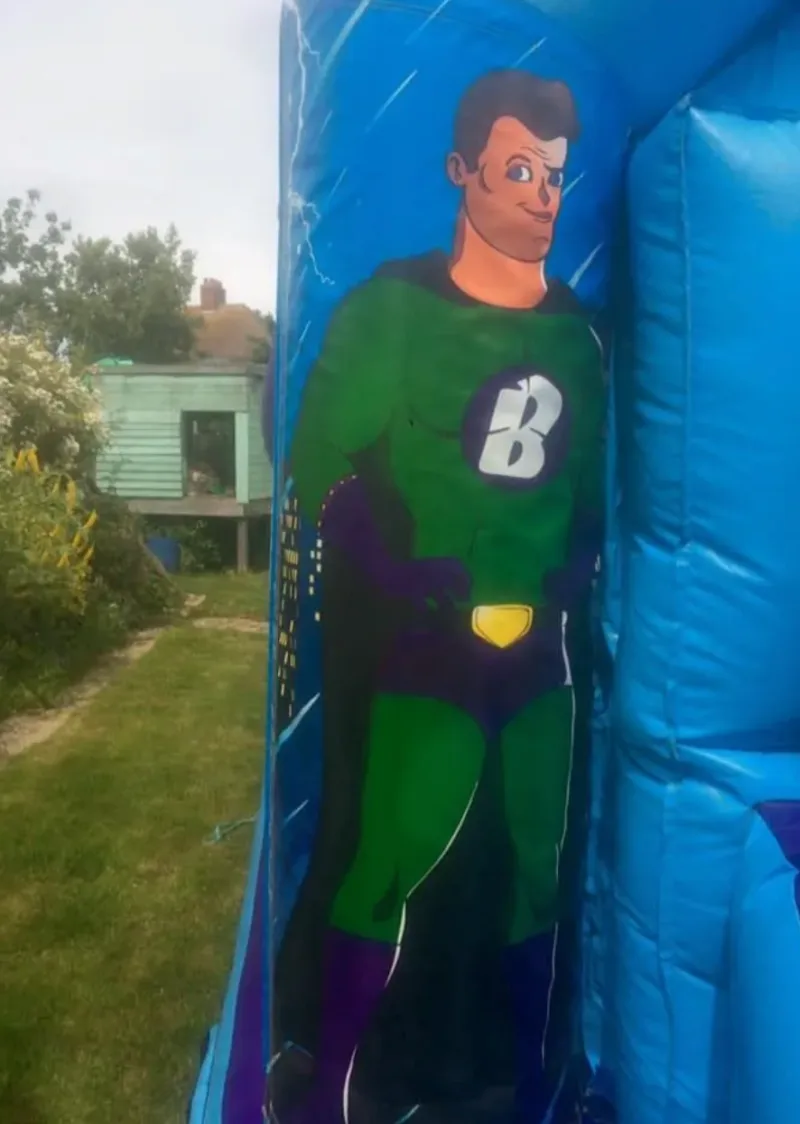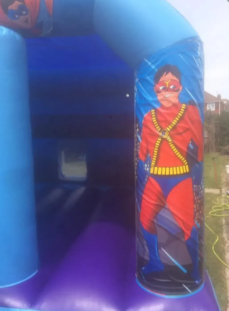 Our Super hero dance and bounce castle is a great addition to our ever popular Disco Domes range and are exclusive to our customers in Dorset.This is one of many themes available and is supplied with an osalating, intergrated LED light pulsing an array of colours inside the bouncing area, it also boasts a great concealed bluetooth speaker that can blast out your chosen playlist for your childs party, or just use the music we supply. This creates a great disco atmosphere and turns the superhero disco dome into a kids disco party.