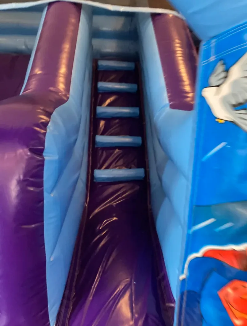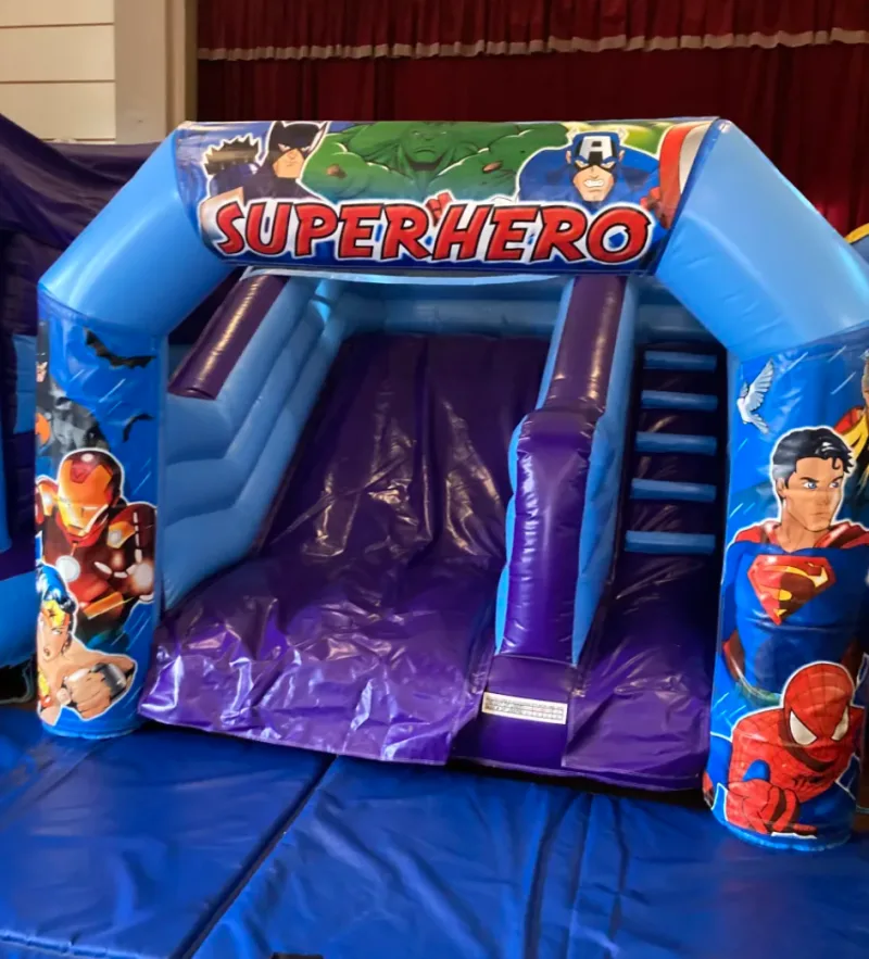 it's up up and away with this magnificent, superhero slide. Ideal for those younger children and sure to keep them entertained. Great on its own or as part of a Superhero Party Packagesor our Superheroes Bouncy Castle With Slide