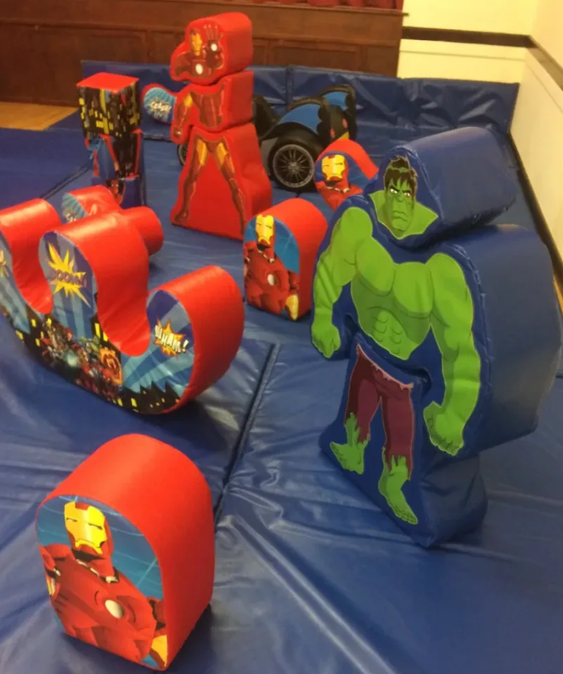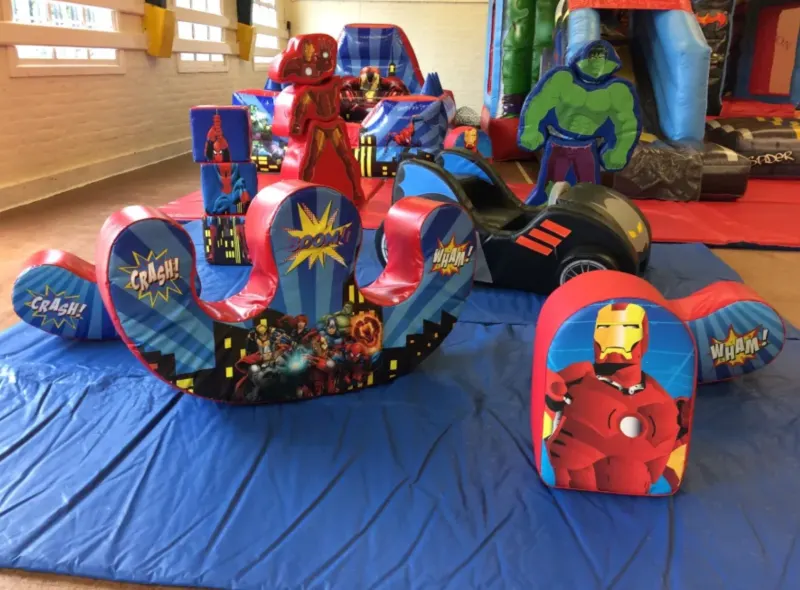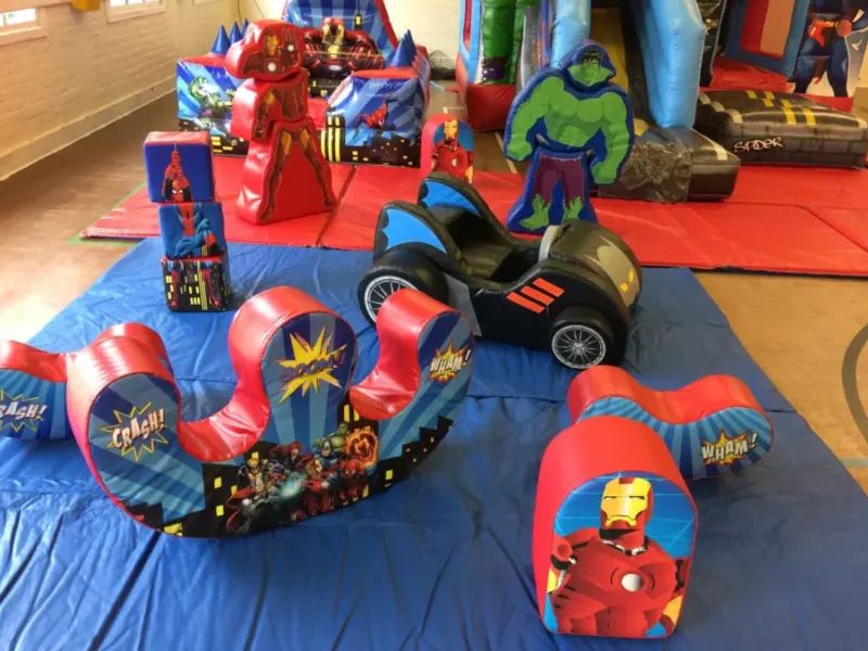 This amazing package is supplied with fantastic clean blue safety mats, a spectacular build and play bat mobile, build and play soft play figures of Ironman and the Hulk, super hero double rockers, jelly bean rockers plus various other avengers softplay blocks. There is simply no other superhero soft play set of this quality in the Dorset area.
