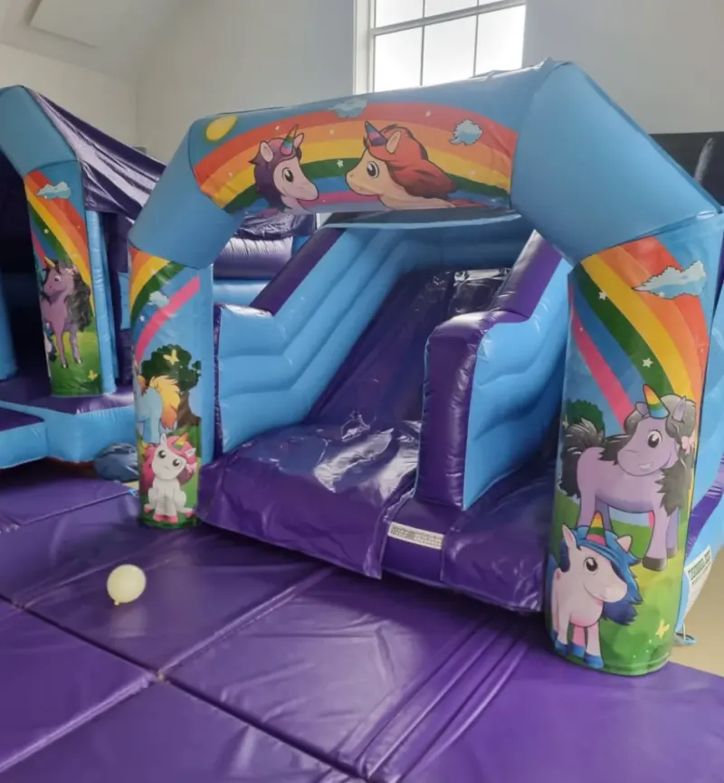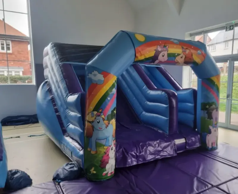 Our new unicorns inflatable slide is particularly impressive not only in appearance but also safety and design. This bouncy slide has been manufactured to accommodate toddlers and children up to 1.3 m in height . This unicorns slide is fantastic as a stand alone inflatable for your child's party or can be added to any of our other inflatables , party packages or unicorns party packages . Featuring a 5.5 ft platform and a very impressive overall height of 8.1 ft or 2.5m it fits into even the lowest of halls and is ideal for small areas or as an add on . Great for children's parties as mums and dads can watch their children scale the steps and come sliding down the slide ,with massive smiles of excitement and pleasure on their faces.